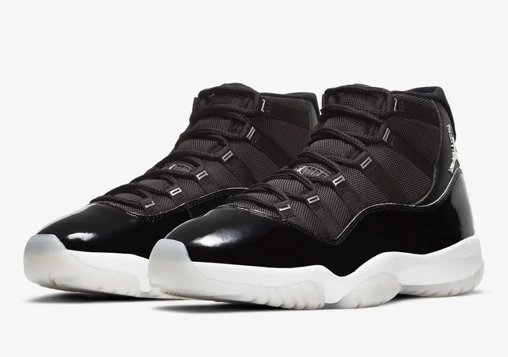 Firstly, it is a brand new colorway of the Air Jordan 11, featuring black patent leather and black mesh on the upper with silver accents adding an elegant touch to the overall look of the shoe. These silver accents include the Jumpman logo on the heel, but also Jordan lettering on the eyelets. The midsole is a standard foam, but with a carbon fiber shank plate and a full-length Air-unit, all these features provide extra stability and superior cushioning. The outsole looks to be a creamy white rubber and it offers traction of different training surfaces.