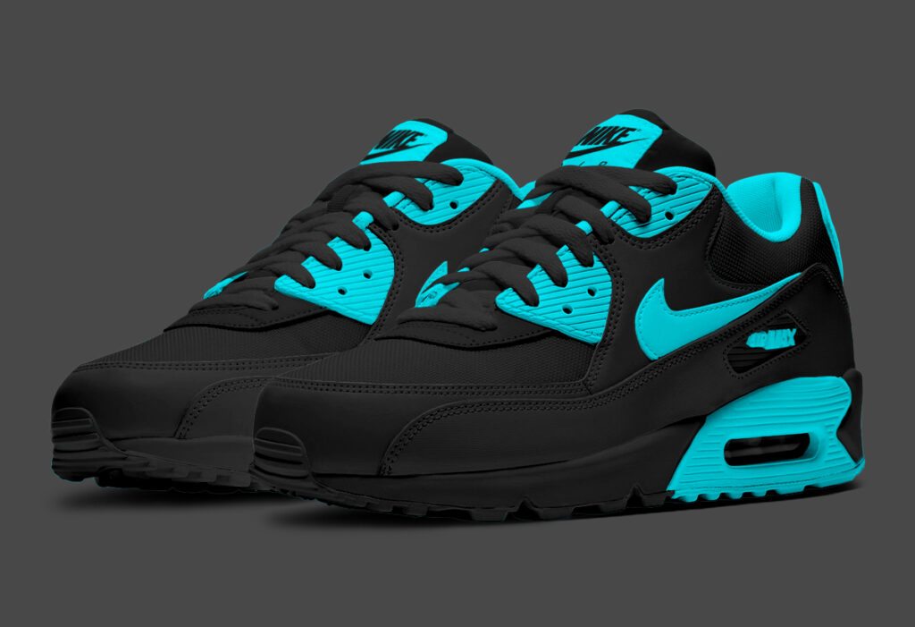 let’s discover this design, starting with the materials used in the construction of this pair, It boasts a mix of high-quality leather and mesh materials. This Air Max 90 features an all-black upper with dark turquoise accents. The toes are covered in black leather, with matching side panels and mudguards. The laces also are wrapped in black color and the plastic tag on the sides is seen in black color to add a unique touch. The Dark Turquoise color highlights different elements, it covers the plastic eyelet panels. The sock linings also are painted in Dark Turquoise which suggests that the interior is also in the same color. While the tongues are black, the tags are in blue with black NIKE AIR branding. The back branding is also adorned with the dark turquoise shade as well as the Air Max branding on the lateral sides. To the special detail, the Nike leather Swooshes are in dark turquoise, giving this design a magical look. To finish off the design, the midsoles are all-black with matching rubber outsoles, while the block of the Air unit sole is covered in dark turquoise.